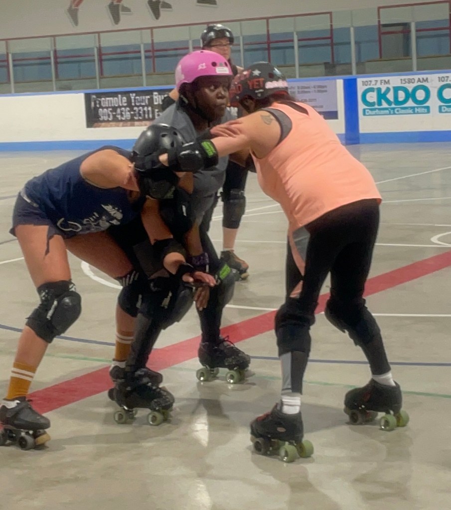 “Right now, we don’t have the bodies, so I’m not just the PR and media,” said AK. “I’m also temporarily taking the head of our bouts role. We’ve already done one scrimmage with our sister league Peterborough Area Roller Derby. “