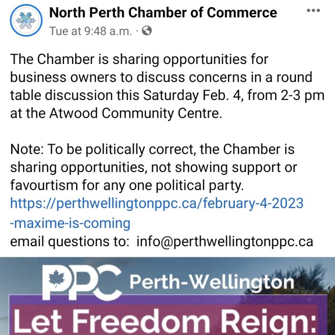 On January 31, North Perth Chamber of Commerce Chair Sharon D’Arcy shared a Facebook post on the Chamber page promoting a People’s Party of Canada event, which upset some member businesses and organizations. The PPC and its leader Maxime Bernier have a reputation for being racist, misogynist, and homophobic.